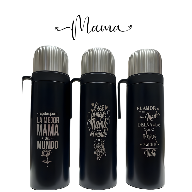 Estos termos grabados de acero inoxidable combinan elegancia, calidad y amor en cada diseño. Su acabado negro mate y sus frases inspiradoras los convierten en el regalo ideal para el Día de la Madre o cualquier ocasión especial.